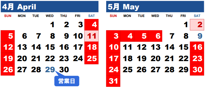 2026年4月30日(木)~2026年5月 1日(金)通常営業